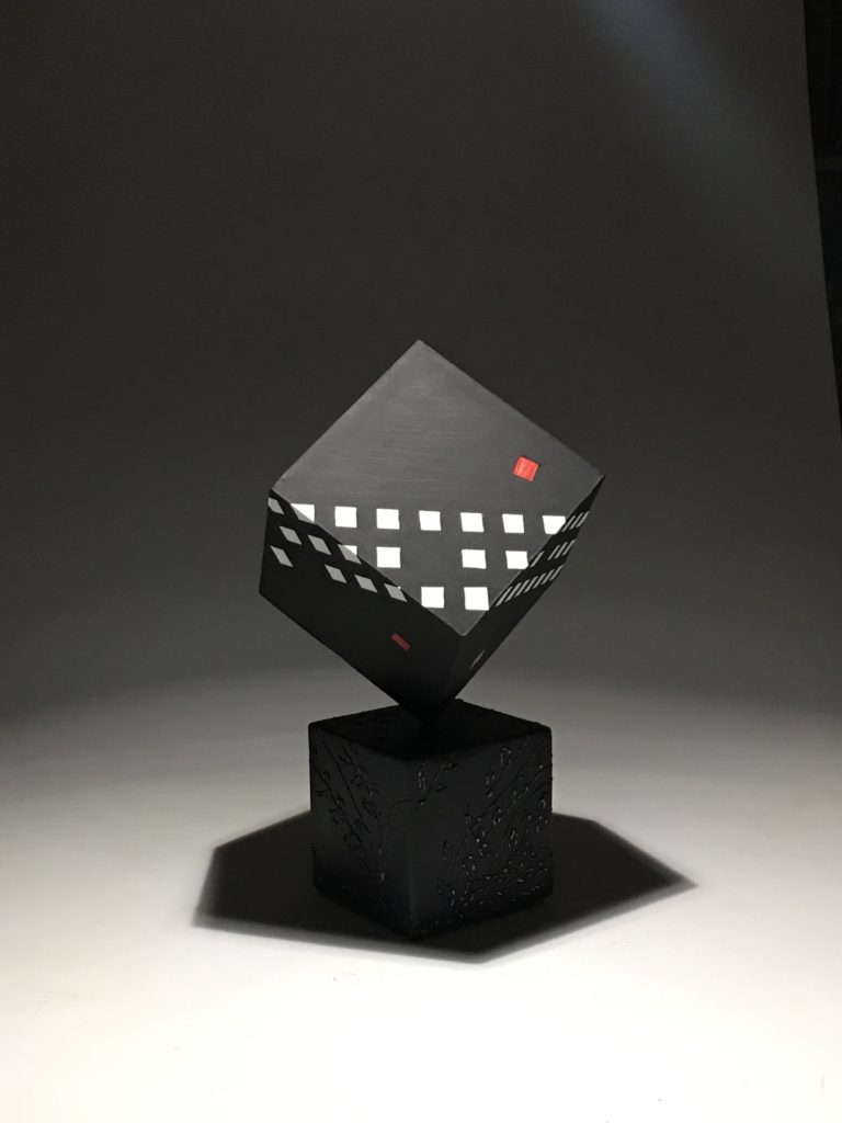 Uniform white squares are meticulously arranged as a path around a blackened cube of steel. On each side a red square appears misplaced…perhaps alone. In the words of Michelle Obama, it is a challenge to square “who you are with where you come from and where you want to go.” B